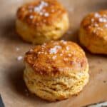 The image shows three thick, round biscuits with a golden brown top, scattered with coarse salt crystals, resting on brown parchment paper. Each biscuit appears to have a rough, crumbly texture with visible layers indicating a flaky interior. The parchment paper lies on a worn, silver baking tray, and the background is softly blurred to keep the focus on the freshly baked biscuits. The overall color scheme is warm with golden and light brown hues. photo taken with an iphone --ar 4:5 --v 7