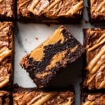 - Cool and Serve: Let the brownies cool completely in the pan on a wire rack before removing via the parchment paper overhang. Drizzle more warmed cookie butter on top if desired before slicing into squares and serving.