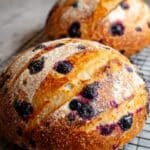 This Blueberry Lemon Cream Cheese Sourdough Bread combines the tangy flavor of sourdough with the fresh zing of lemon and sweetness of blueberries. Swirls of cream cheese add a creamy texture to each slice, making it a perfect artisanal bread for breakfast or a special snack. The bread is naturally fermented overnight, enhancing the depth of flavor and creating a light, airy crumb.