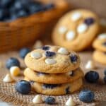 A close-up view of three soft, round cookies stacked slightly on a brown woven mat, each cookie golden brown with visible white chocolate chips and dark blueberry pieces spread across the top and inside. In front of the cookies, several fresh blueberries and white chocolate chips lie scattered on a white marbled surface. In the background, a light-colored woven basket filled with dark blue blueberries and a small stack of similar cookies with white chocolate chips are softly blurred. The scene is bright and inviting, with natural light highlighting the textures of the cookies and blueberries. photo taken with an iphone --ar 4:5 --v 7