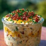 A clear glass jar filled with a thick, creamy dip showing a mix of three layers: the creamy base speckled with green herbs and bits of red and orange, a middle layer with melted yellow cheese blending into the creamy mix, and a topping layer of crispy brown bacon bits and bright green chopped chives evenly spread on top. The jar sits on a wooden surface with a blurry outdoor background. Photo taken with an iphone --ar 4:5 --v 7