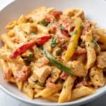 - Mix Pasta, Chicken, and Veggies: Stir cooked pasta into the sauce to coat evenly. Add the cooked chicken along with any accumulated juices and the sautéed peppers and onions, stirring gently to combine and heat through.