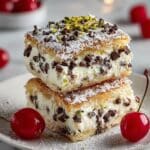 - Cool and Serve: Remove from the oven and let cool for at least 30 minutes to allow the filling to set, making it easier to cut into squares. Garnish with chopped pistachios, maraschino cherries, or extra chocolate chips as desired before serving.