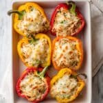 These Creamy Chicken Stuffed Peppers are a delicious and healthy meal option featuring tender bell peppers filled with a flavorful mixture of shredded chicken, reduced-fat cream cheese, salsa verde, and cheddar cheese. Baked to perfection, this comforting dish delivers a perfect balance of creamy texture and zesty flavor, making it ideal for a nutritious weeknight dinner.