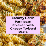 Keywords: Creamy Garlic Parmesan Chicken, Cheesy Twisted Pasta, Skillet Chicken, One-Pan Dinner, Quick Dinner Recipe