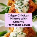 Store leftover chicken pillows in an airtight container in the refrigerator for up to 3 days. Reheat gently in the oven at 350°F to maintain crispiness or in the microwave for convenience. Keep the Parmesan sauce refrigerated separately and reheat on the stove with a splash of milk to loosen it before serving.
