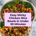 These Sticky Chicken Rice Bowls combine juicy, tender chicken glazed in a garlicky honey-soy sauce served over fluffy jasmine rice. Perfectly balanced with savory and sweet flavors, this quick and easy recipe comes together in under 30 minutes, making it ideal for weeknight dinners or meal prep. Topped with green onions and toasted sesame seeds, it offers a satisfying and flavorful meal inspired by Asian cuisine.