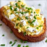 This Easy 6-Ingredient Egg and Ricotta Toast recipe offers a creamy, soft scrambled egg dish elevated with fresh ricotta cheese and chives, served atop toasted sourdough bread for a comforting and elegant breakfast or brunch option.