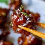 A close-up image of two pieces of sticky, shiny glazed chicken held by light brown wooden chopsticks. The chicken pieces have a rich dark brown color with a glossy texture from the sauce coating, dotted with small bits of green herbs. The background is softly blurred, showing more pieces of similarly glazed chicken on a white marbled surface. Photo taken with an iphone --ar 4:5 --v 7