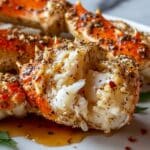 A close-up view of a piece of cooked crab leg with a textured shell showing burnt orange and white colors, sprinkled with coarse spices and black pepper, resting on a white plate with a few green herb leaves partially visible underneath; the crab meat inside is white and flaky, with tiny red chili flakes scattered on top, and a small amount of shiny brown sauce pooling beneath the crab piece, all placed on a white marbled surface. photo taken with an iphone --ar 4:5 --v 7