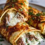 French Dip Tortilla Roll Ups are irresistible handheld appetizers featuring thinly sliced roast beef and melted cheese wrapped in crispy baked flour tortillas. Served with a rich, flavorful au jus made from beef broth and seasonings, these roll ups combine the classic tastes of a French dip sandwich in a fun, bite-sized form perfect for parties or casual meals.