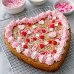 - Decorate: Transfer the frosting into a piping bag fitted with a star tip. Pipe frosting along the edge of the cooled cookie cake and decorate with additional sprinkles. Optionally, use a fine piping tip to write a personalized Valentine’s message in the center.