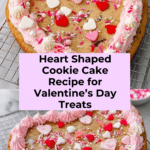 Keywords: heart shaped cookie cake, Valentine’s Day dessert, chocolate chip cookie cake, pink frosting cookie, festive cookie recipe