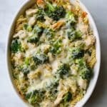 A creamy, delicious high protein alfredo bake featuring chickpea pasta, tender chicken breast, broccoli, and a rich cottage cheese and Greek yogurt-based sauce. This recipe combines high protein ingredients with traditional Italian flavors, baked to golden perfection with melted mozzarella topping, perfect for a nutritious and satisfying dinner.