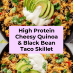 This High Protein High Fiber Cheesy Quinoa & Black Bean Taco Skillet Delight is a flavorful, hearty dish perfect for a nutritious weeknight dinner. Packed with vibrant vegetables, protein-rich quinoa and black beans, and melty cheese, it’s a satisfying meal that’s easy to prepare and sure to please the whole family.