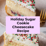 Keywords: holiday sugar cookie cheesecake, sugar cookie crust cheesecake, festive cheesecake recipe, cream cheese dessert, holiday dessert, Christmas cheesecake, baked cheesecake