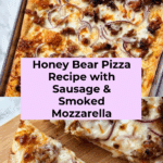 Honey Bear Pizza is a flavorful, hearty homemade pizza featuring a deliciously browned hot Italian sausage, layered mozzarella cheeses including smoked mozzarella, and a creamy white sauce base. Finished with a drizzle of raw honey, this pizza balances savory and sweet perfectly, baked to golden bubbly perfection on a thin crust.