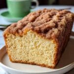 A rectangular loaf cake sits on a white plate, showing a soft, light yellow crumb with a moist texture inside. The top of the cake is richly covered with a thick layer of coarse sugar mixed with cinnamon, giving it a grainy and slightly crusty look in warm brown shades. The sides and bottom have a darker, golden-brown crust, contrasting with the pale interior. In the background, there is a blurred green cup and another white plate on a white marbled surface. photo taken with an iphone --ar 4:5 --v 7