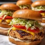 - Assemble the Burgers: Spread a thin layer of mayonnaise (if using) on the bottom bun, add shredded iceberg lettuce, then place the cheesy chicken patty on top. Layer with tomato slices and pickles. Spread burger sauce on the top bun and crown the burger. Serve immediately for best flavor and texture.