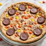 Keywords: peanut butter cookie pie, peanut butter dessert, loaded cookie pie, Reese’s Pieces cookie, fall dessert, party dessert, chocolate peanut butter pie