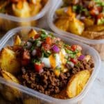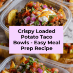 Loaded Potato Taco Bowls are a delicious and satisfying meal prep option featuring crispy roasted Yukon Gold potatoes, seasoned ground beef, fresh pico de gallo, and a spicy sriracha mayo. Perfect for busy days, these bowls combine bold Mexican-inspired flavors with hearty ingredients, making a balanced and customizable dish for lunch or dinner.