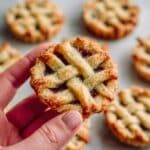 A close-up of a small round pie with a golden brown lattice crust on top, showing some dark fruit filling peeking through the grid pattern. A woman's hand is holding the pie in the foreground, and several more mini pies with the same lattice tops are blurred in the background on a white marbled surface. The lattice crust has a slightly rough texture with some sugar sprinkled on it, and the fruit filling looks glossy and thick. photo taken with an iphone --ar 4:5 --v 7