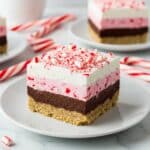 This image shows a square slice of layered dessert on a white plate placed on a white marbled surface. The bottom layer is a light brown, crumbly crust. Above it is a pink and white creamy layer with bits of crushed candy cane visible, followed by a thick dark chocolate layer. The top layer is white, fluffy whipped cream, decorated with large pieces of crushed red and white candy cane scattered on top. In the background, there is another slice of the same dessert on a white plate and several whole candy canes. Photo taken with an iphone --ar 4:5 --v 7