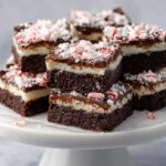 A white cake stand holds multiple square brownies stacked and arranged in a pile. Each brownie has three clear layers: a dense, dark brown base; a middle white creamy layer; and a top glossy dark brown chocolate layer sprinkled with small white and red crushed peppermint pieces. The brownies have clean, straight edges, and the white marbled surface beneath the stand is softly blurred in the background. photo taken with an iphone --ar 4:5 --v 7