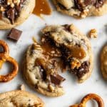 Keywords: pretzel caramel cookies, caramel stuffed cookies, chocolate chip pretzel cookies, easy homemade cookies, soft caramel cookies