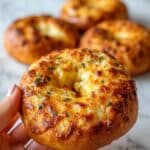 A close-up image shows a round, baked bagel with a thick, golden-brown crust on the outside. The bagel is topped with melted cheese that is light yellow and slightly browned in spots, with small green herbs sprinkled on top. There are bits of crispy bacon or similar savory pieces embedded within the cheese layer, adding texture and color contrast with their reddish-brown tones. The background shows more of these bagels softly out of focus on a white marbled surface. A woman's hand is holding the bagel gently from the side, showing the full top view of the bagel and toppings. Photo taken with an iphone --ar 4:5 --v 7