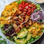 - Assemble the salads: Distribute the chopped lettuce evenly between bowls or plates. Top with sliced grilled chicken, diced tomatoes, black beans, sliced red bell pepper, avocado slices, corn, sliced red onion, and tortilla strips. Garnish with cilantro and lime wedges. Drizzle the prepared spicy ranch dressing over the salad just before serving to maintain freshness and crunch.