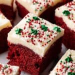 A close-up of square red velvet cake pieces with thick white cream cheese frosting between two layers and covering the top, decorated with small red, green, and white round sprinkles and tiny green holly leaf-shaped decorations. The cake texture looks soft and moist with a smooth creamy frosting. The pieces are placed closely together on a white marbled surface. Photo taken with an iphone --ar 4:5 --v 7