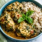 This Slow Cooker Pesto Chicken recipe combines tender chicken breast with sun-dried tomatoes, spinach, and a flavorful sun-dried tomato pesto. Cooked slowly for optimal juiciness and richness, it’s finished with reduced fat crème fraîche and Parmesan cheese, creating a creamy, delicious meal perfect served over rice.