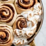 6. Finish the rolls: Spread the marshmallow meringue topping over the warm rolls. Optionally, use your oven’s broiler or a small blowtorch to lightly toast the meringue topping for a classic s’mores effect.