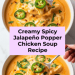 Warm up with this creamy and flavorful Spicy Jalapeño Popper Chicken Soup, inspired by the classic jalapeño popper appetizer. This hearty dinner soup features tender shredded chicken, crispy bacon, a blend of cheeses, and a touch of heat from fresh jalapeños. It’s easy to make on the stovetop and perfect for a comforting meal that’s both satisfying and spicy.