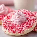 Keywords: Strawberry Kiss Cookies, Funfetti sugar cookies, Valentine’s Day cookies, soft chewy cookies, Hershey’s Strawberry Ice Cream Cone Kisses, cream cheese cookies, festive cookies, pink chocolate, holiday treats