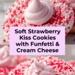 Soft, chewy Strawberry Kiss Cookies made with Funfetti sugar cookie mix, cream cheese, and topped with Hershey’s Strawberry Ice Cream Cone Kisses. These delightful cookies are perfect for Valentine’s Day or any occasion that calls for a sweet, colorful treat with a creamy strawberry center.
