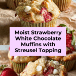 Keywords: Strawberry muffins, white chocolate muffins, streusel topping, breakfast muffins, fruit muffins, homemade muffins