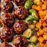 - Bake Meatballs and Vegetables: Return the pan to the oven and bake for 14 to 16 minutes, or until the meatballs reach an internal temperature of 165°F, sweet potatoes are tender, and Brussels sprouts are golden and crispy.