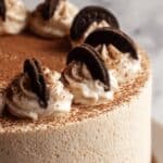 A close-up image of a round cake with a smooth, light cream layer covering the whole outer surface. On the top edge of the cake, a circle of white whipped cream dollops is evenly placed, each topped with a half piece of dark brown cookie. The center of the cake’s top is dusted with a fine layer of light cocoa powder, adding a soft brown color and texture contrast to the cream. The background shows a white marbled texture. Photo taken with an iphone --ar 4:5 --v 7