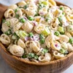 A close-up view of a wooden bowl filled with creamy pasta salad, featuring small shell-shaped pasta coated in a white sauce mixed evenly with green peas, small pinkish-red onion bits, and light green celery pieces for contrast. The bowl is placed on a white marbled surface, showing a textured and fresh look to the salad with the mix of soft and crunchy ingredients. The colors stand out in soft lighting, highlighting the creamy texture and fresh vegetables. Photo taken with an iphone --ar 4:5 --v 7